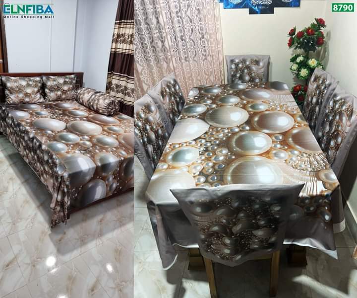 মোট 11 পিস এর কম্বো সেট 3D প্রিন্টেড ৬ পিছ চেয়ার কভার ,ডাইনিং টেবিল কভার এবং বেড শিট131