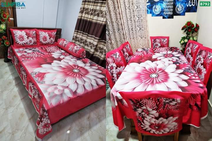 মোট 11 পিস এর কম্বো সেট 3D প্রিন্টেড ৬ পিছ চেয়ার কভার ,ডাইনিং টেবিল কভার এবং বেড শিট132