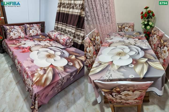 মোট 11 পিস এর কম্বো সেট 3D প্রিন্টেড ৬ পিছ চেয়ার কভার ,ডাইনিং টেবিল কভার এবং বেড শিট134