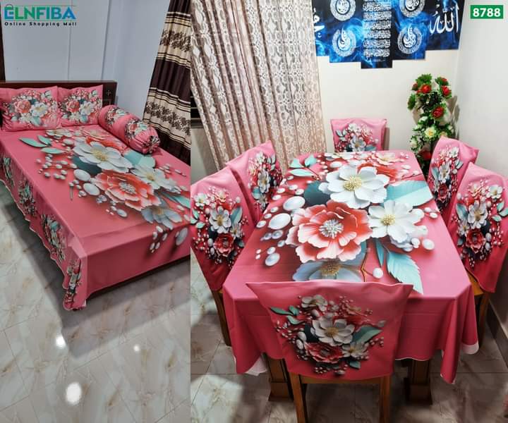 মোট 11 পিস এর কম্বো সেট 3D প্রিন্টেড ৬ পিছ চেয়ার কভার ,ডাইনিং টেবিল কভার এবং বেড শিট136